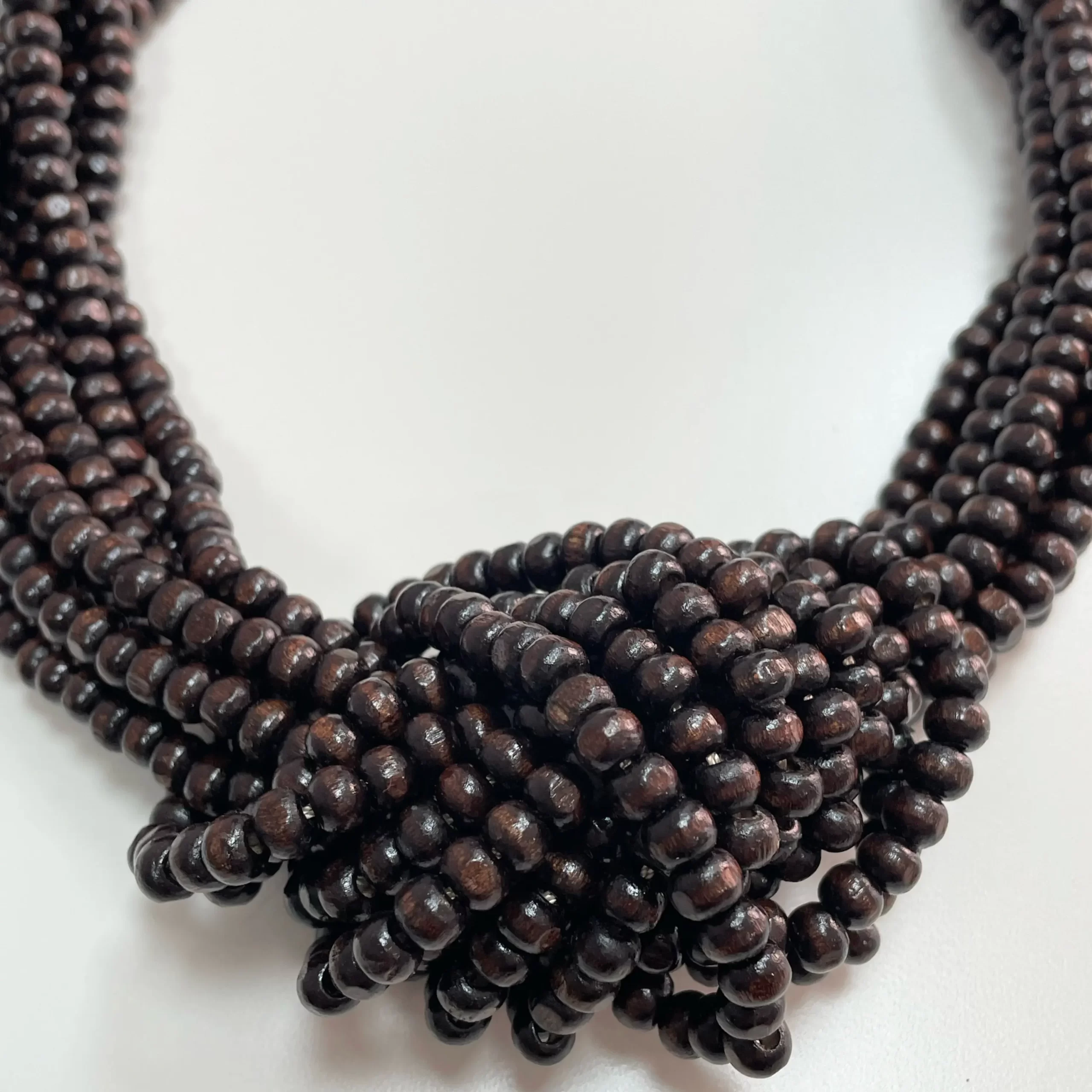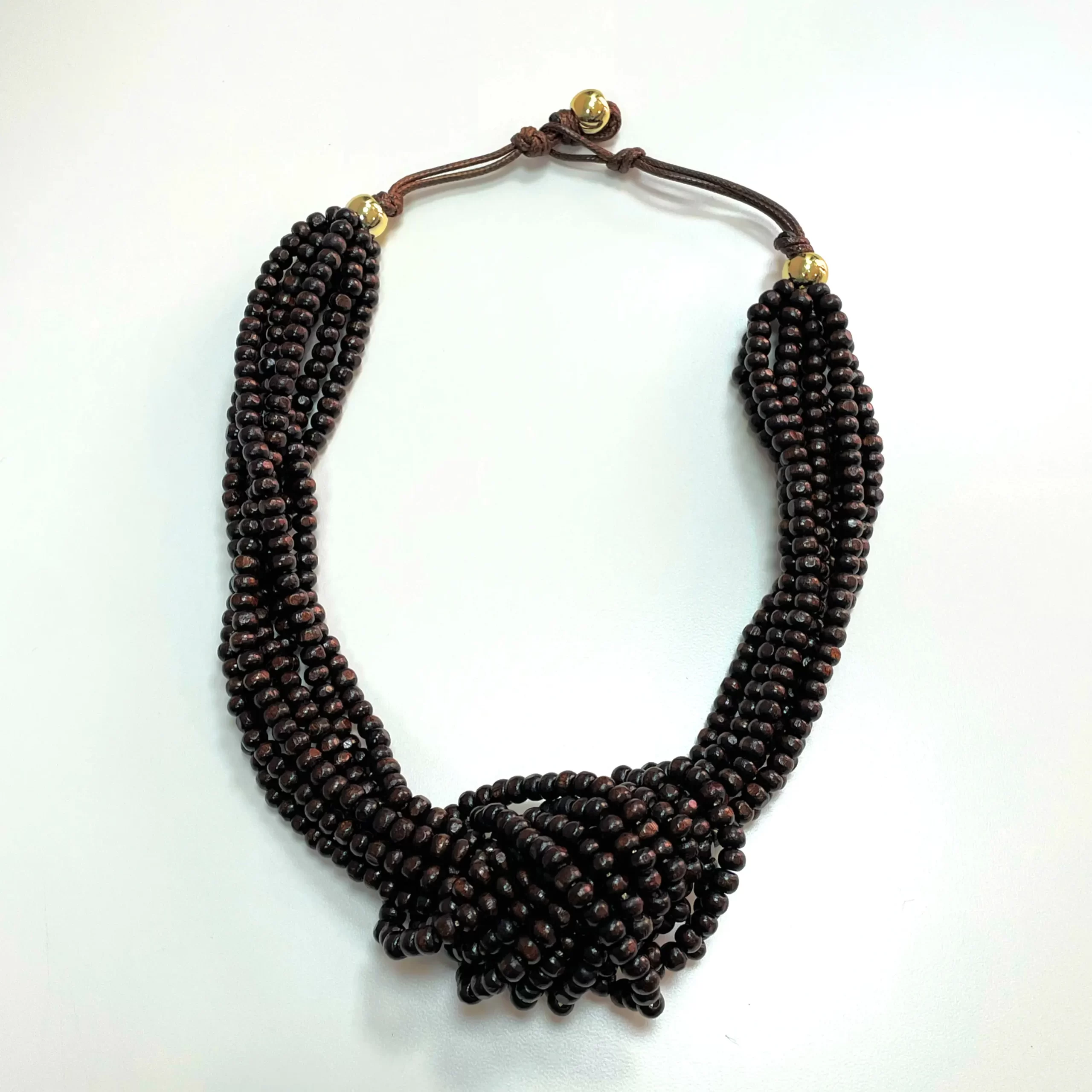 Collar con nudo de bolas de madera color marrón oscuro.